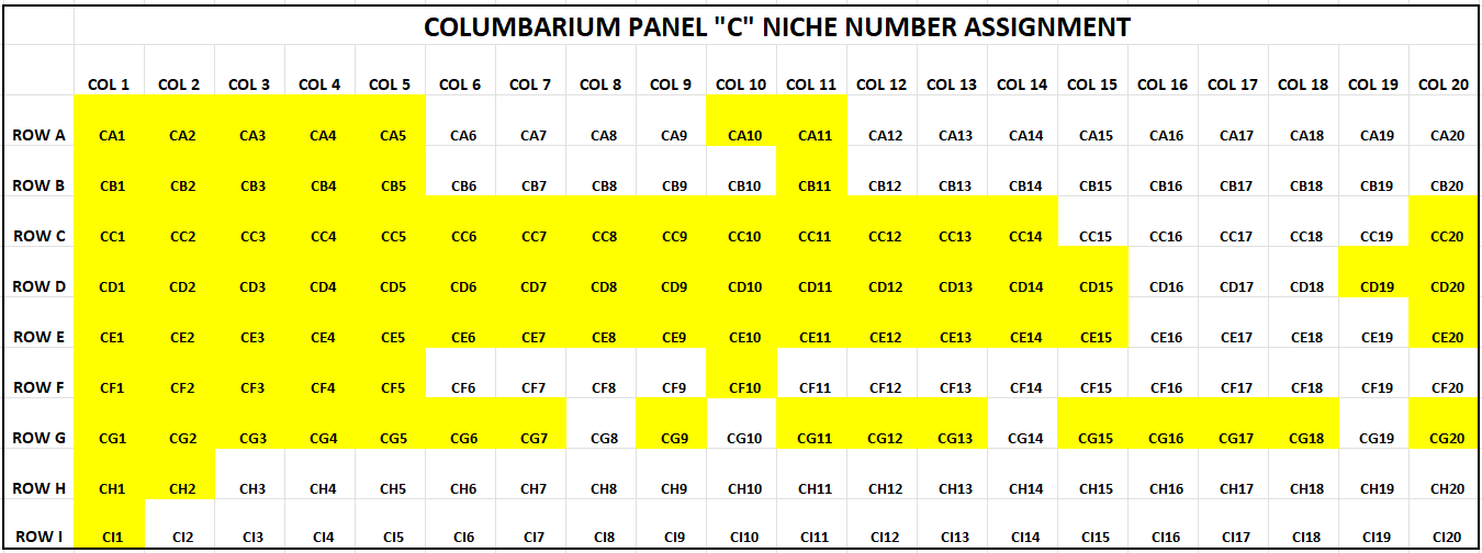 Listed below is an image of niches that are available for subscription. The niches highlighted in yellow have already been subscribed while the ones listed in white are still available. Panel B is the wall of niches to the left of the Cross and Panel C is the wall of niches to the right of the Cross. Please contact Robert in the church office for confirmation of availability.