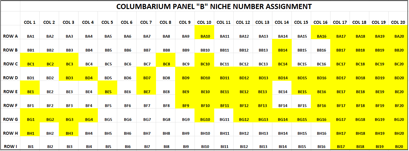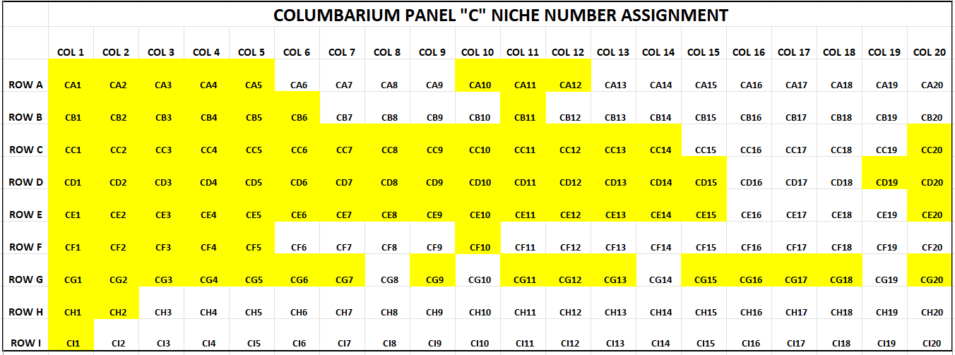 Listed below is an image of niches that are available for subscription. The niches highlighted in yellow have already been subscribed while the ones listed in white are still available. Panel B is the wall of niches to the left of the Cross and Panel C is the wall of niches to the right of the Cross. Please contact Robert in the church office for confirmation of availability.